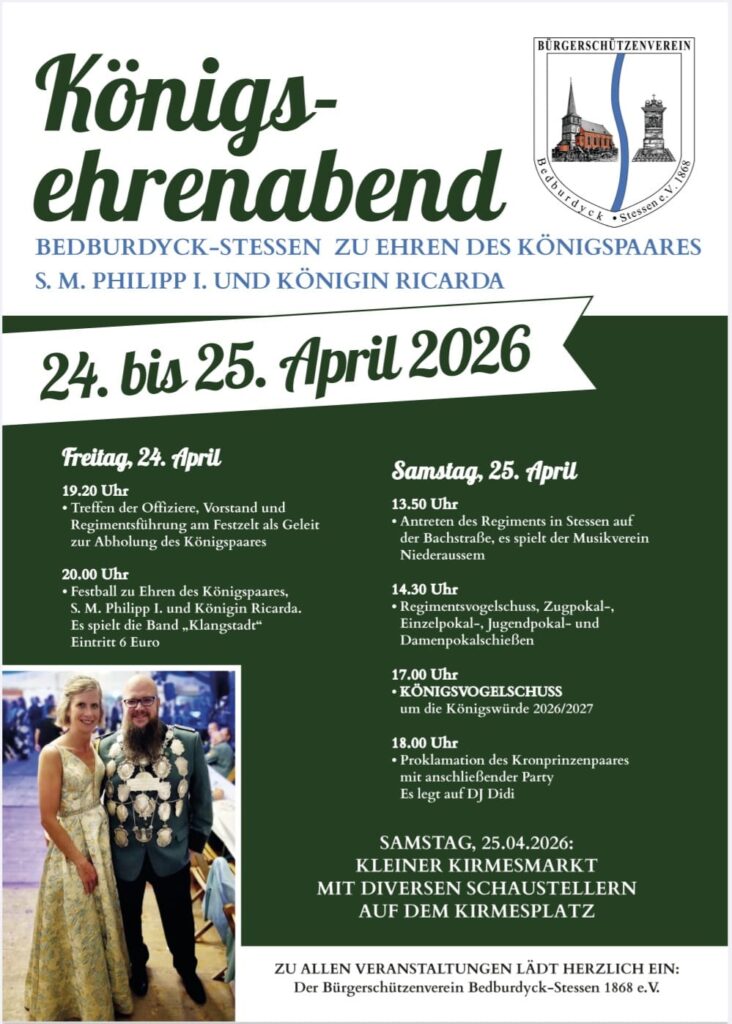 Am Samstag, den 28.03.2026, organisierte der BSV Bedburdyck-Stessen wieder eine Dorfreinigung in den beiden Heimatdörfern. Zahlreiche junge und ältere Einwohner und Schützen befreiten dabei Wege und Flächen von Müll und Unrat. Auch S.M. Philipp und Königin Ricarda sowie einige Mitglieder des Königszuges „Wilder Hirsch“ haben kräftig mitangepackt, so dass Bedburdyck und Stessen nun wieder in vollem Glanz erstrahlen können. Zum Abschluss wurden alle Teilnehmer in die Karl-Justen-Halle geladen, um sich gemeinsam zu stärken. Vielen Dank an alle Helferinnen und Helfer für diese tolle Aktion.
